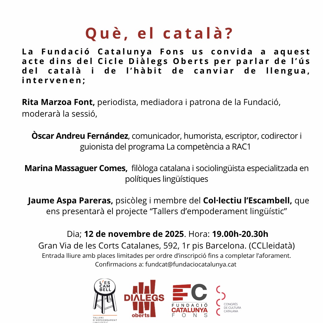 El cicle de reflexió que impulsa la Fundació Catalunya Fons –i que s’emmarca en la programació del Congrés de Cultura Catalana, atesa l’expertesa dels participants, la singularitat i l'actualitat dels debats–, proposa una sessió que s’afegeix a la reflexió sobre la llengua que el nou Congrés està realitzant. Un debat amb l'humorista Òscar Andreu, la filòloga Marina Massaguer i el psicòleg Jaume Aspa Pareres, del Col·lectiu l'Escambell, que ens parlaran de la necessitat de prendre consciència de la importància de mantenir el català i de les eines psicològiques per fer-ho.